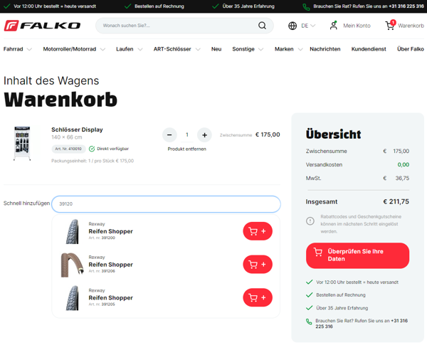 Sie möchten schnell etwas aus dem Warenkorb hinzufügen? Mit der Option "Schnelles Hinzufügen" ist das jetzt ganz einfach. Geben Sie die Artikelnummer, EAN oder den Namen des Produkts ein und klicken Sie auf Ihre Produkte.