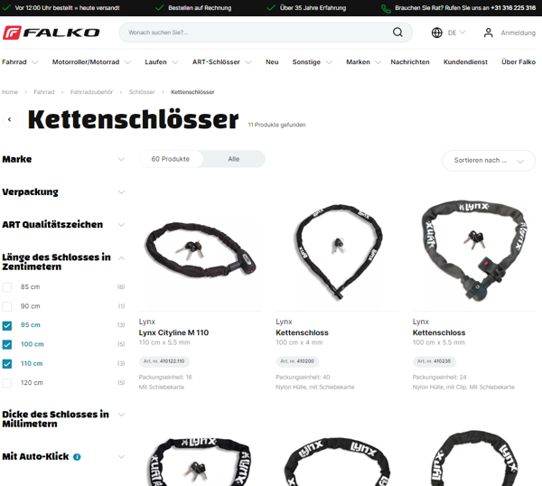Jetzt ist es noch einfacher, das gewünschte Produkt zu finden. Klicken Sie über die Produktfilter auf die gewünschten Eigenschaften und nur die Produkte, die diesen Kriterien entsprechen, werden angezeigt. In der Rubrik Schlösser können Sie jetzt z.B. auch nach Schlosslänge und -stärke filtern.