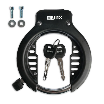 The ART 2 approved frame lock from Lynx in workshop packaging. Optimal protection against breaking, with a 10 mm hardened steel bracket. This black ring lock is suitable for various types of bikes and comes with 2 keys. Including fixing material.