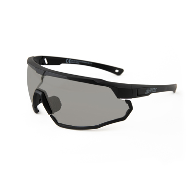 These matte black premium Lynx sports sunglasses, called Galibier, deliver exceptional performance on bright and sunny days. The dark grey/smoke lens with Sky Blue REVO coating belongs to category 3 in terms of light transmission (15%). Besides good vision, the Galibier goggles offer 100% protection against UV radiation and the Anti-fog lens will not fog up. There is nothing more annoying than a pair of glasses that keep falling off your nose, so the nose pads are adjustable and made of rubber. In addition, the glasses have anti-slip surfaces on the inside of the glasses' temples and they can be kept extra in place by means of the elastic band, which you can easily click on the end of the glasses' temples. Should you not like the strips on the bottom of the glasses, they can easily be removed. The frame of the glasses is made of TR90 thermoplastic material, which is very durable, flexible and lightweight. The goggles come in a hard case with a goggle cloth.