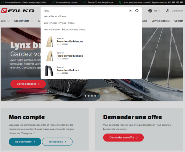 La nouvelle barre de recherche 'intelligente' pense avec vous ! Par exemple, si vous recherchez le mot "pneu", la barre de recherche vous montre immédiatement les catégories et sous-catégories dans lesquelles vous pouvez trouver des pneus, ainsi que des suggestions de produits. Vous pouvez ainsi passer directement des résultats de la recherche à la catégorie de produits souhaitée.
