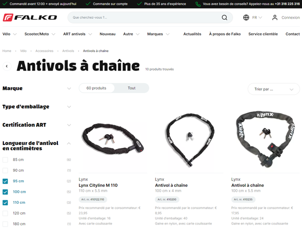 Il est maintenant encore plus facile de trouver le produit souhaité. Cliquez sur les propriétés souhaitées via les filtres de produits et seuls les produits répondant à ces critères seront affichés. En ce qui concerne les antivols, vous pouvez maintenant, par exemple, filtrer également sur la longueur et l'épaisseur de l'antivol.