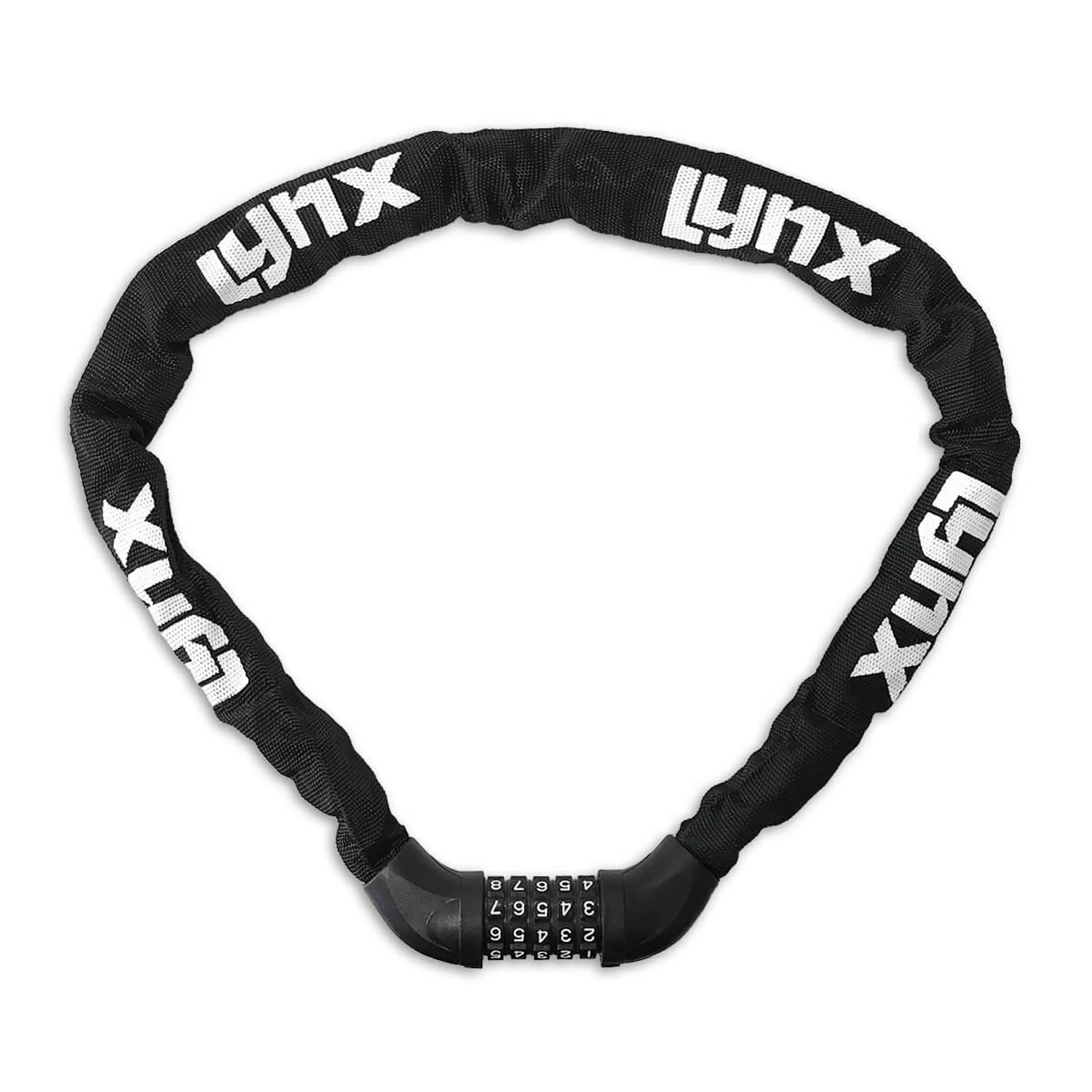 Antivol à chaîne à combinaison Lynx avec housse en nylon noir. Chaîne en acier trempé de 6 mm et résistante aux intempéries. Longueur 100 cm. Avec une combinaison à 5 chiffres réglable à souhait. Cet antivol Lynx offre une sécurité optimale pour le vélo. Avec carte coulissante.