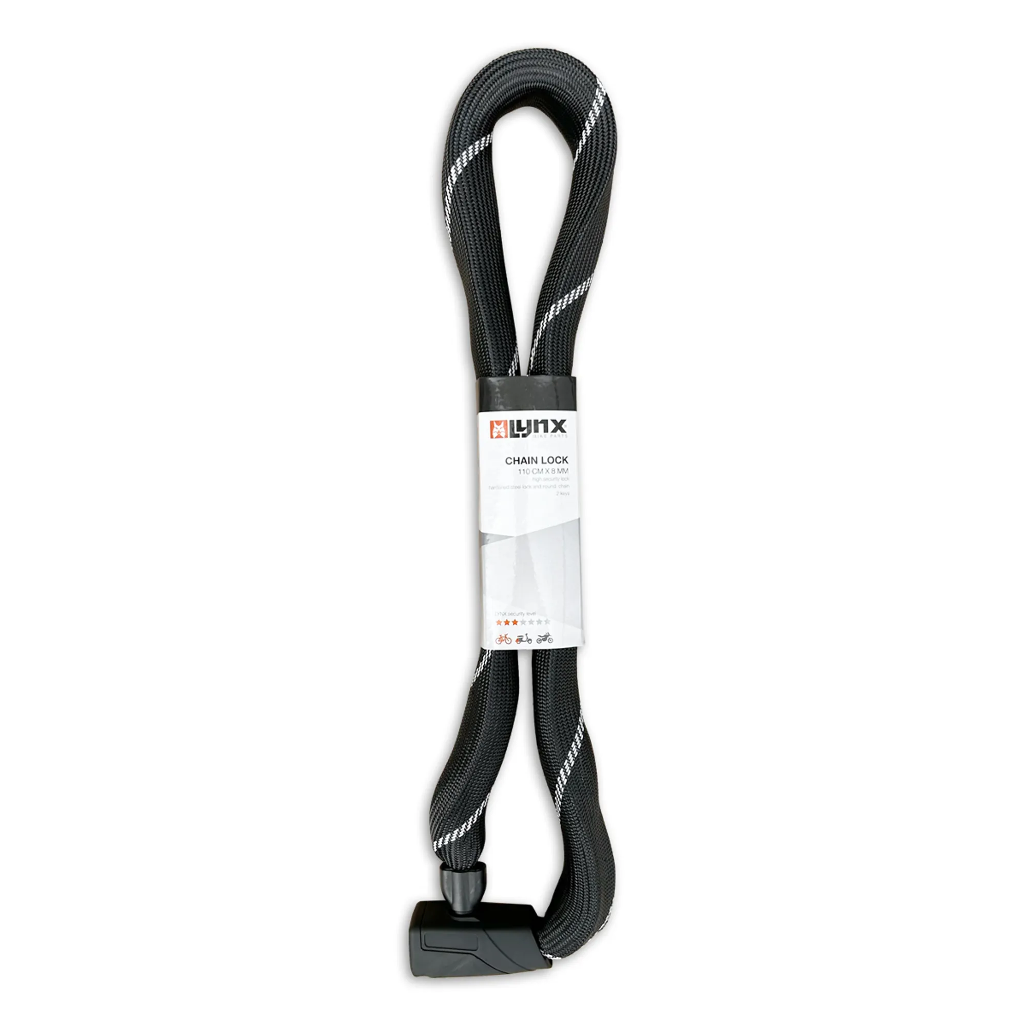 Avec cet antivol Bronx de 110 cm de long de Lynx, vous fixez facilement un vélo de ville ou un vélo électrique à un objet, tel qu'un poteau ou une clôture. Il est ensuite solidement fixé grâce aux maillons carrés en acier trempé d'un diamètre de 8 mm. Le manchon en maille, à la fois solide et souple, est résistant à l'usure et respectueux du cadre du vélo. Le corps de l'antivol est doté d'une fonction d'auto-clic, ce qui signifie qu'il n'est pas nécessaire de tourner la clé pour fermer l'antivol, lorsque la goupille de l'antivol est enclenchée dans le corps de l'antivol. L'antivol Bronx est livré avec 2 clés en standard. Avec carte coulissante.