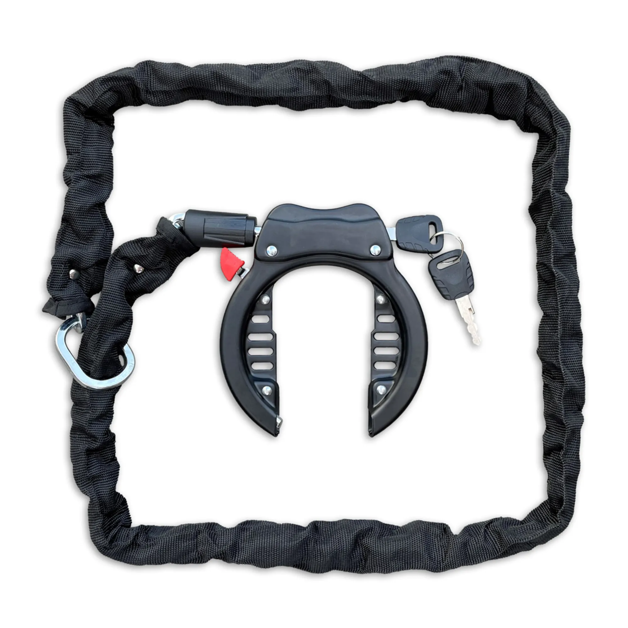 Antivol de cadre Lynx avec chaîne pour une utilisation universelle. L'antivol de cadre est fabriqué en acier trempé et est également résistant aux intempéries. L'antivol de cadre est livrée avec une chaîne de 150 cm de long et 2 clés. En outre, l'antivol est recouvert d'une couche de poudre antirouille. Dans un sac en plastique avec un code-barres autocollant.