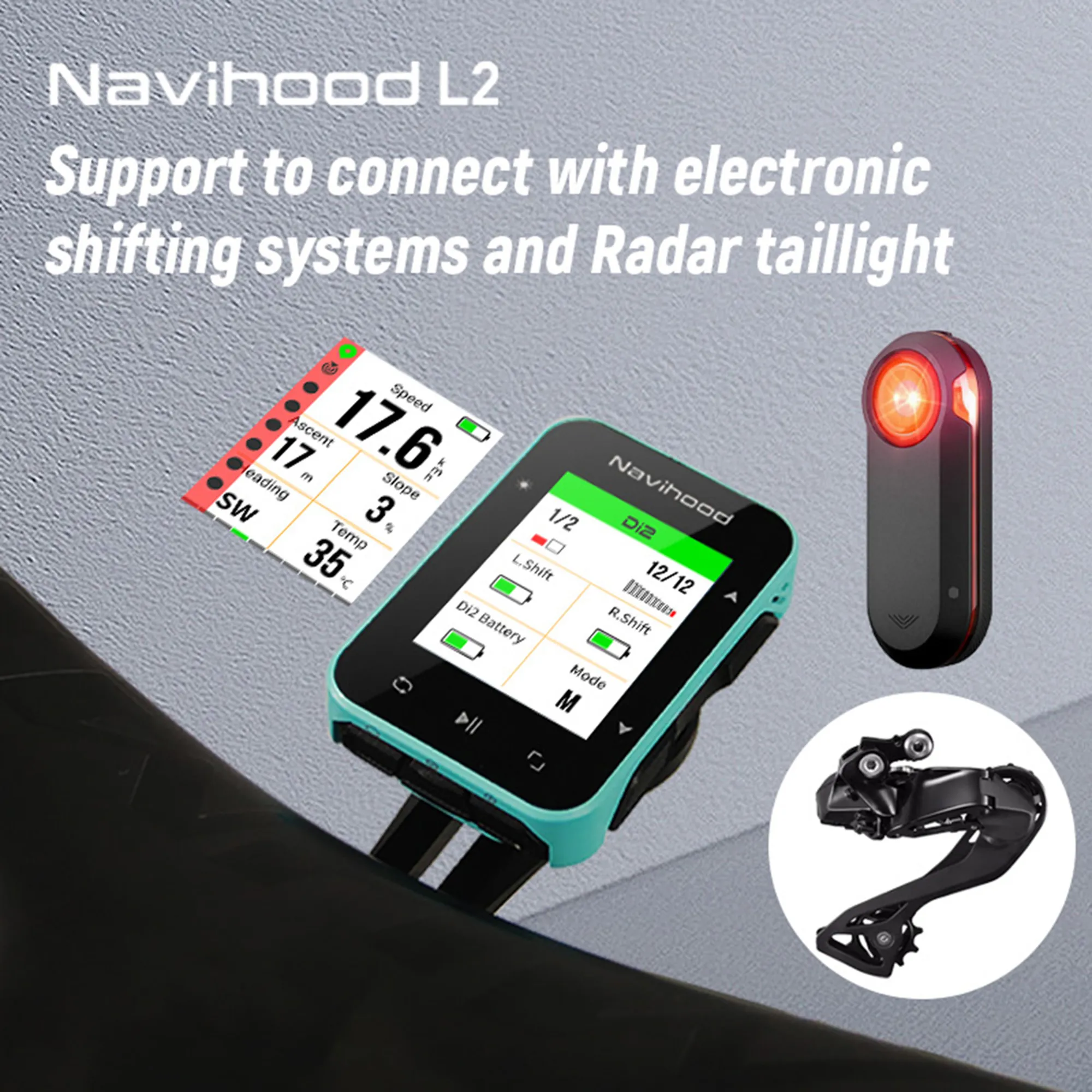 Grâce à la connectivité étendue (ANT+ & Bluetooth), le Navihood L2 est facile à connecter avec, entre autres, un smartphone, un système de changement de vitesse électronique sans fil (par exemple SRAM AXS, Shimano Di2), un éclairage intelligent, des moniteurs de fréquence cardiaque, des capteurs de vitesse et des capteurs de cadence de pédalage.