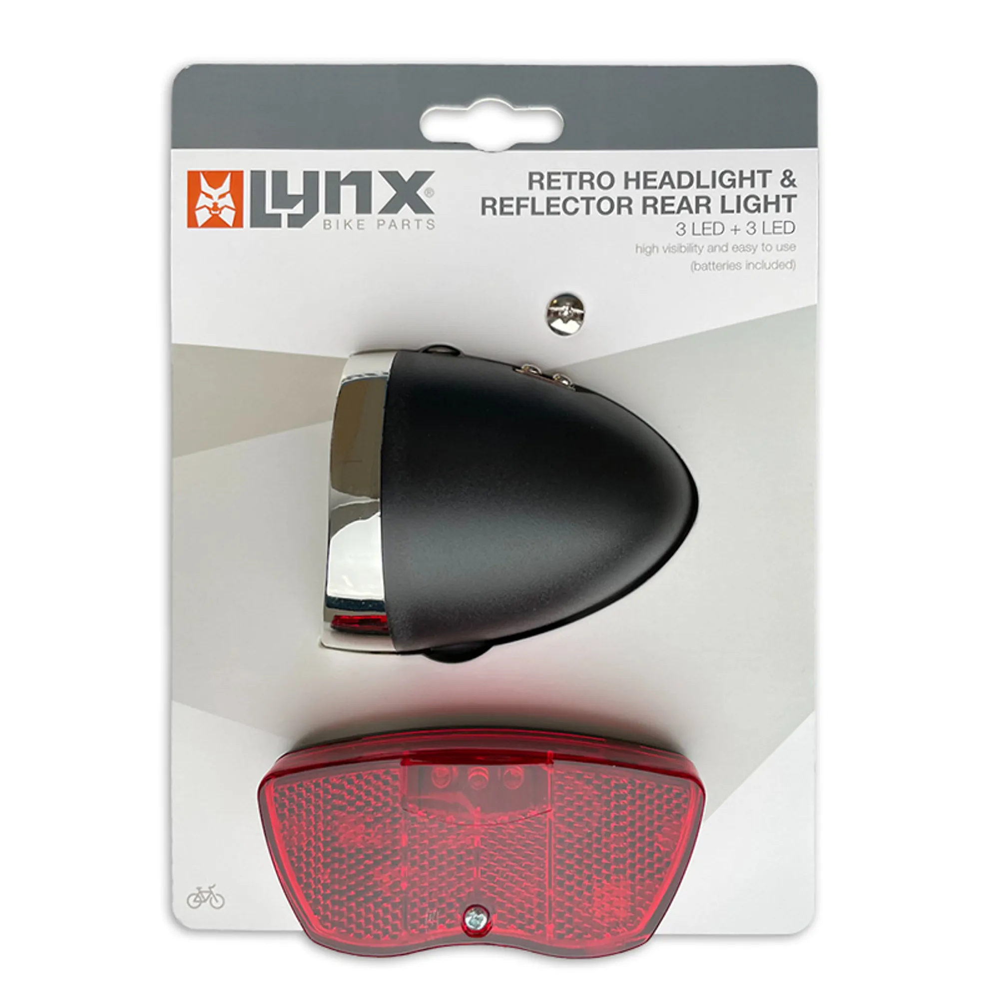 Kit d'éclairage de Lynx composé d'un phare avant rétro avec 3 LED super lumineuses et d'un feu arrière à réflecteur avec 3 LED super lumineuses, tous deux visibles jusqu'à 600 mètres. Le feu arrière s'adapte aux supports de 80 mm de large. Le kit d'éclairage est livré sur une carte à suspendre.