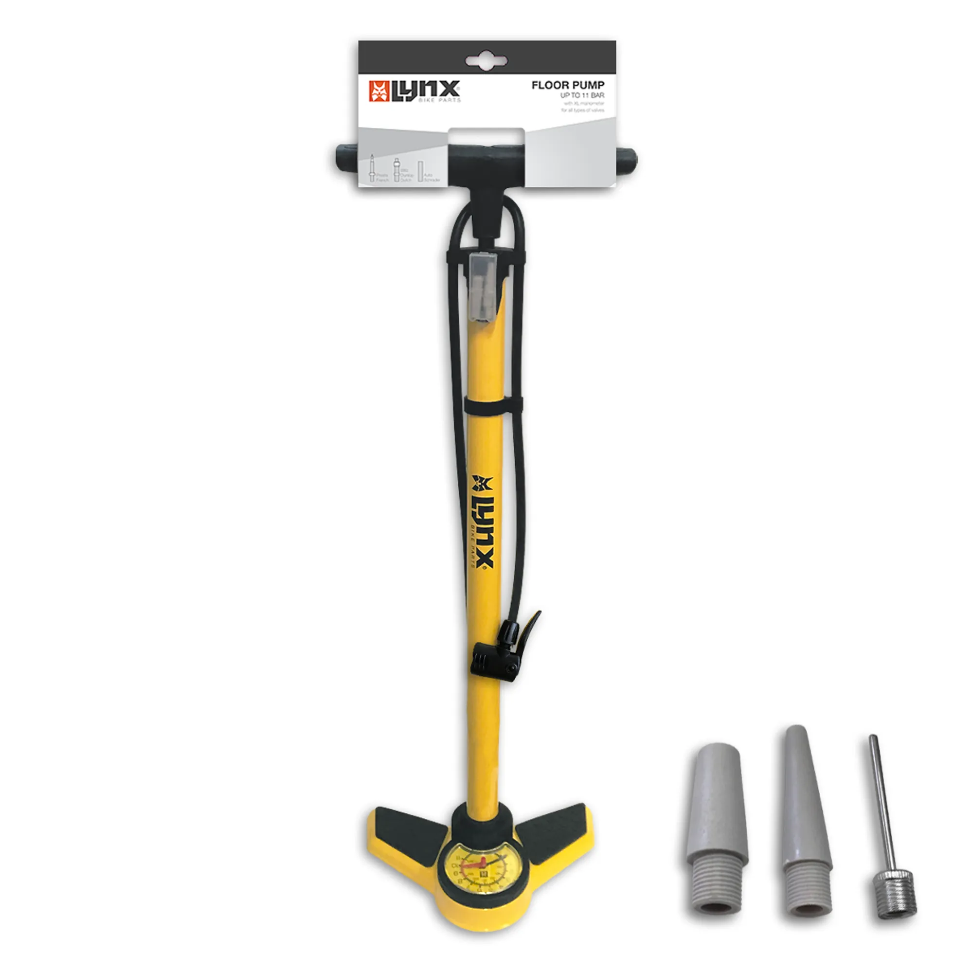 Pompe à vélo robuste en acier de Lynx, avec un manomètre extra-large et précis. La pompe est équipée d'une valve universelle, convenant aux valves Presta, Dunlop et Schrader, et d'un adaptateurs de valve supplémentaires. Outre les pneus de vélo, elle est également idéale pour les ballons, les matelas pneumatiques, etc.
