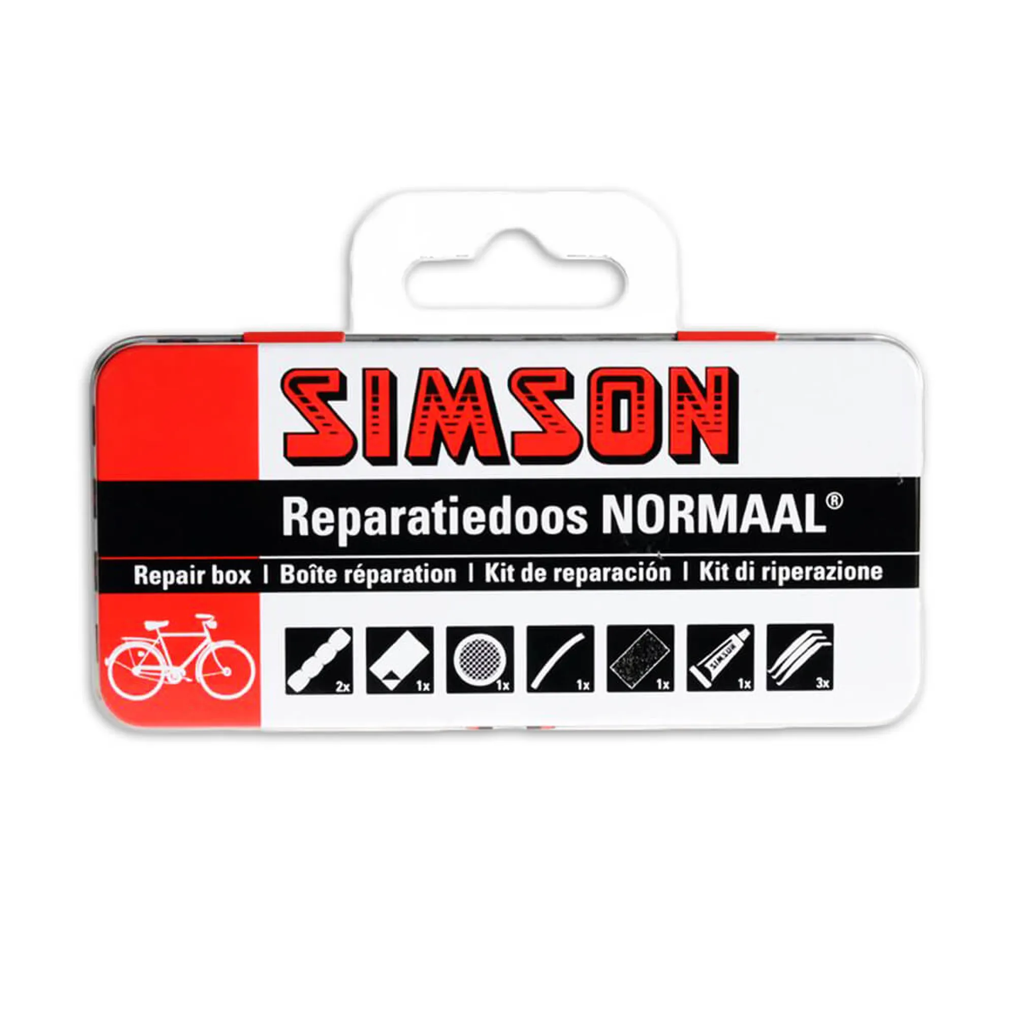 Kit de réparation Simson pour la maison ou la route. Convient à presque tous les pneus de vélo normaux. Kit complet composé de rustines, papier de verre, autocollant pour pneu, tuyau de valve, dissolution et démonte-pneus. Pour 12 opérations. Incluant les instructions d'utilisation.