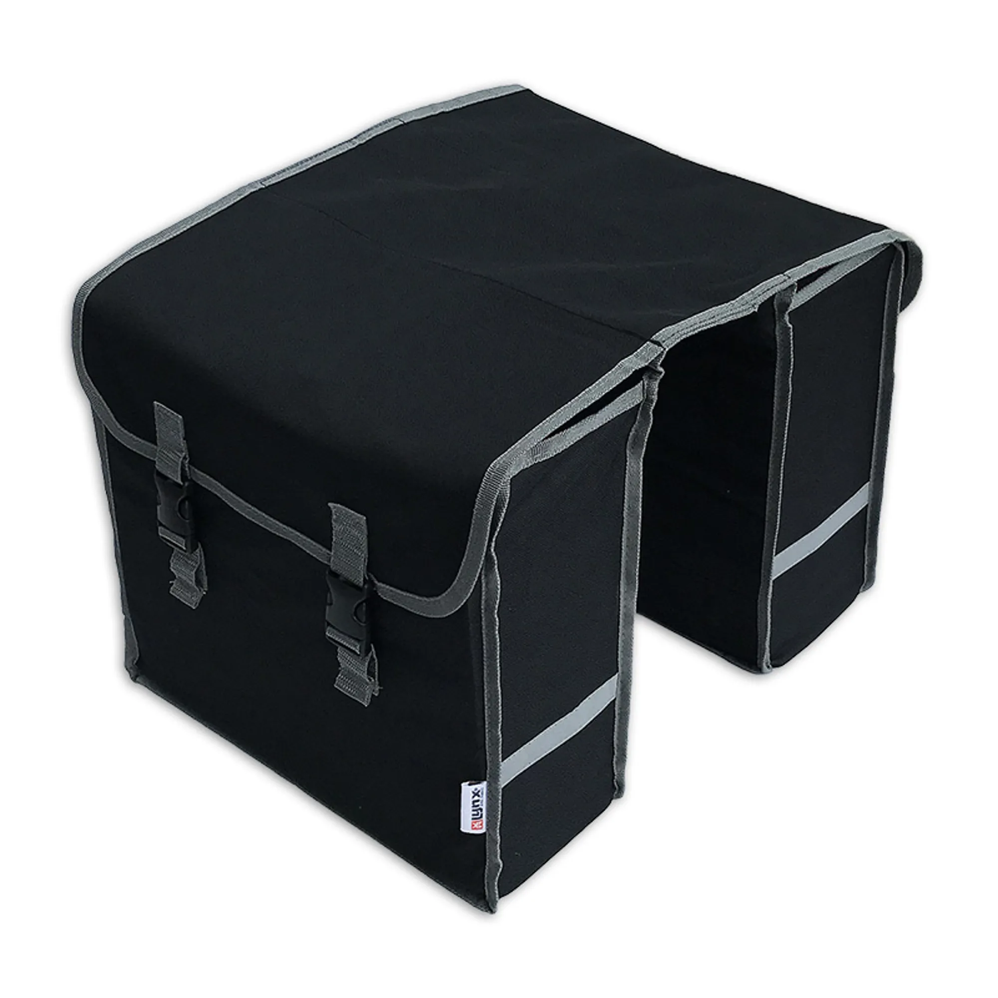 Cette double sacoche à vélo ZION BASIC de Lynx, hydrofuge, avec des sangles gris foncé, est fabriquée en polyester. Cette double sacoche noire permet d'emporter facilement ses affaires et se fixe facilement sur le porte-bagages. Avec carte d'information.