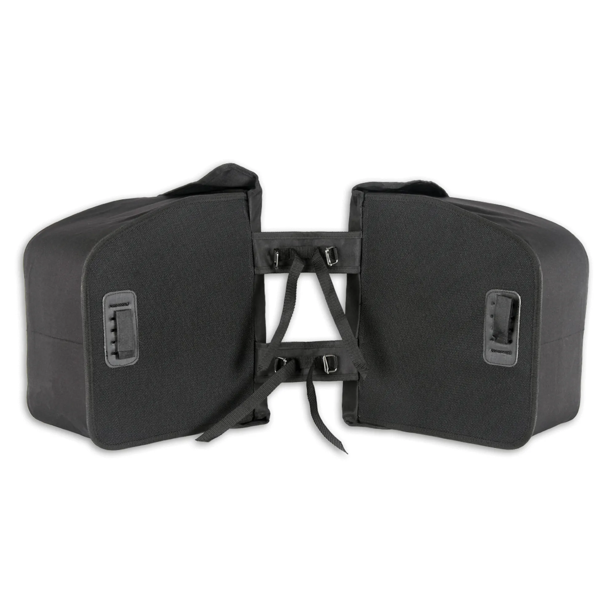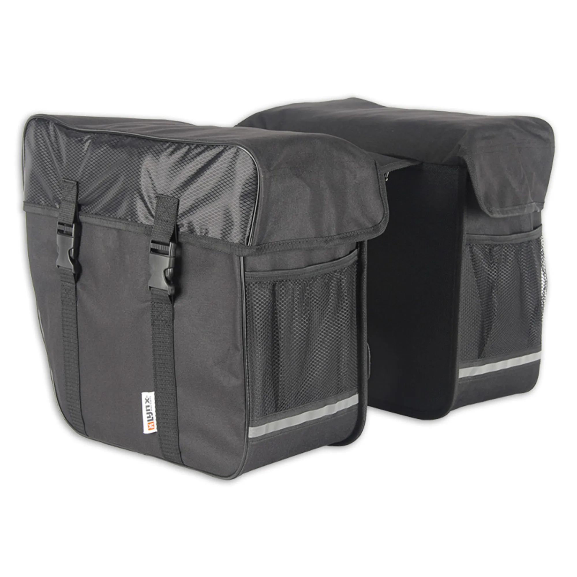 Cette double sacoche pour vélo de Lynx est un accessoire polyvalent pour tout vélo d'homme ou de femme. La sacoche est fabriquée en polyester 600D et rip-stop avec un revêtement en PVC, ce qui la rend imperméable. Avec une capacité de 35 litres et des sangles extra-larges, elle est idéale pour une utilisation sur un vélo normal ou un vélo électrique. L'élément réfléchissant offre une sécurité supplémentaire dans l'obscurité et le renfoncement entre les deux sacoches permet d'utiliser sans problème les sangles à attache rapide. L'arrondi incliné empêche le pédalage contre la sacoche avec le pied, ce qui permet à la sacoche de rester belle plus longtemps. Avec carte d'information.