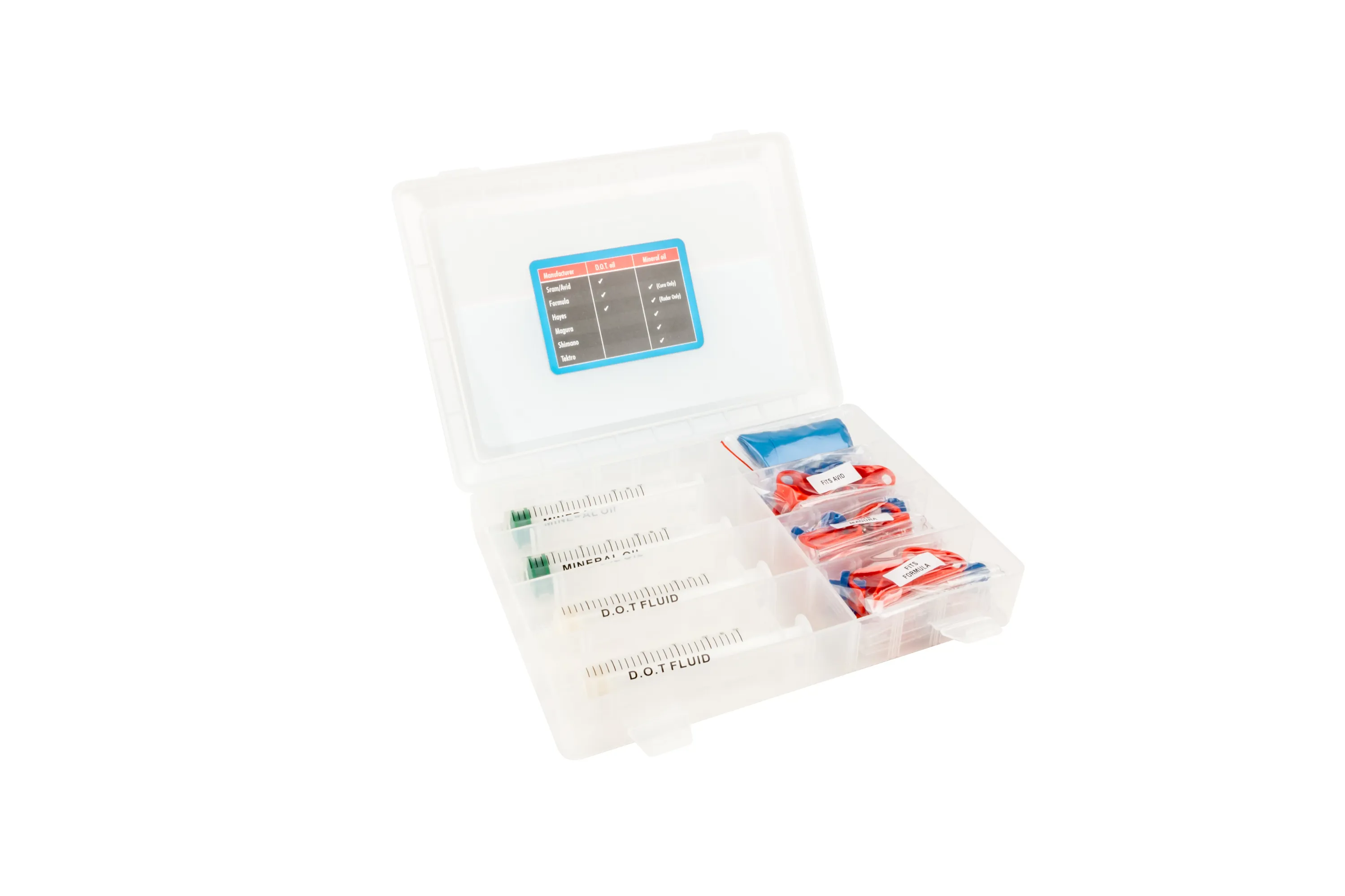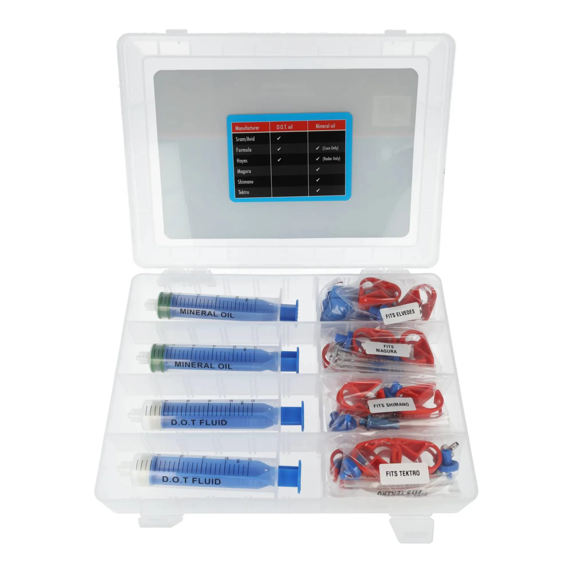 Ce kit de purge est un outil indispensable, adapté à la vidange de l'huile minérale et du liquide de frein DOT. Le kit est équipé de 4 seringues, 2 pour l'huile minérale et 2 pour le liquide de frein DOT. Le kit est complété par des adaptateurs pour les marques de freins les plus connues, notamment Shimano, Magura, Hayes, Formula, Tektro et Avid / Sram.