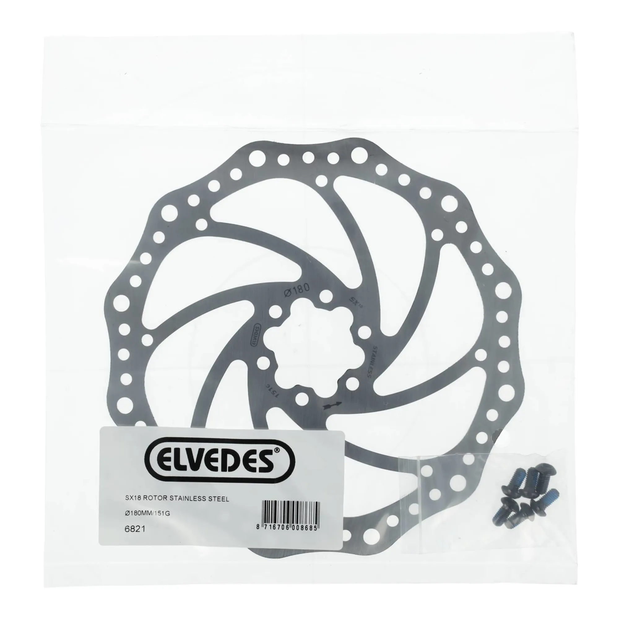 Ce disque de frein SX18 de la marque Elvedes est fabriqué en acier inoxydable et est livré avec 6 boulons de frein à disque pour la fixation. Diamètre de 180 mm. Emballage en plastique.