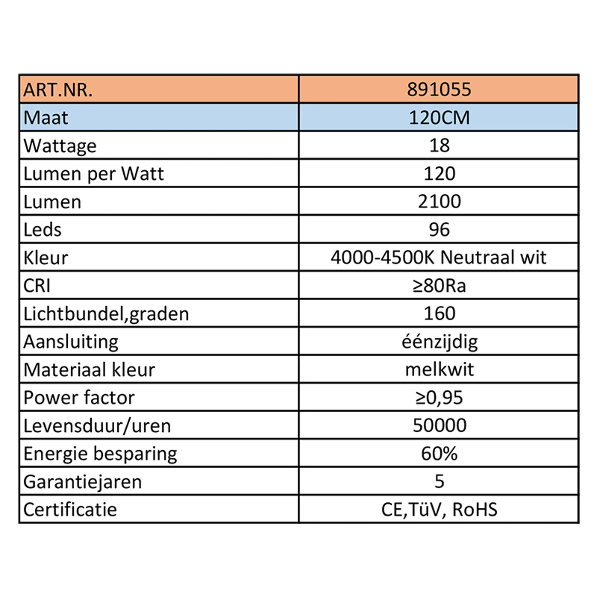 Ce tube fluorescent LED de 120 cm, d'une puissance de 18 watts, est doté d'un connecteur G13 et éclaire votre pièce d'une lumière blanche neutre. Avec ce tube, vous économisez 60 % sur vos coûts d'énergie par rapport à un tube fluorescent normal.Le tube LED comporte 96 Leds et a un faisceau de 160 degrés. Emballé dans un tube solide. Pour les bureaux et les salles d'exposition.