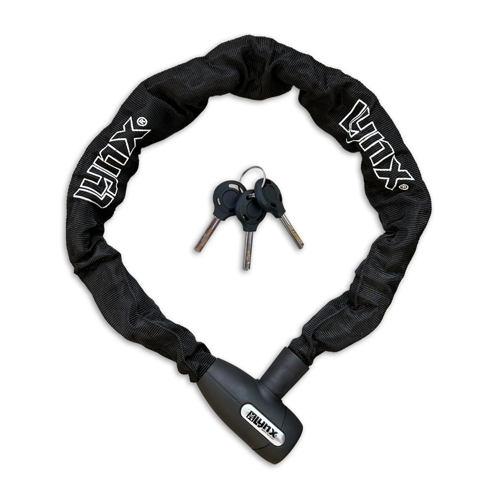 Het Lynx Cityline XL kettingslot heeft een 95 cm lange hoogwaardig geharde stalen ketting met 10 mm dikke vierkante schakels. Dit zwarte veiligheidsslot is weerbestendig en voorzien van het auto-click sluitsysteem*. De kettingschakels zijn omhult met een zachte nylon hoes om beschadigingen aan de fiets of bromfiets te voorkomen. Dit kettingslot wordt standaard geleverd met 3 sleutels. Met schuifkaart.