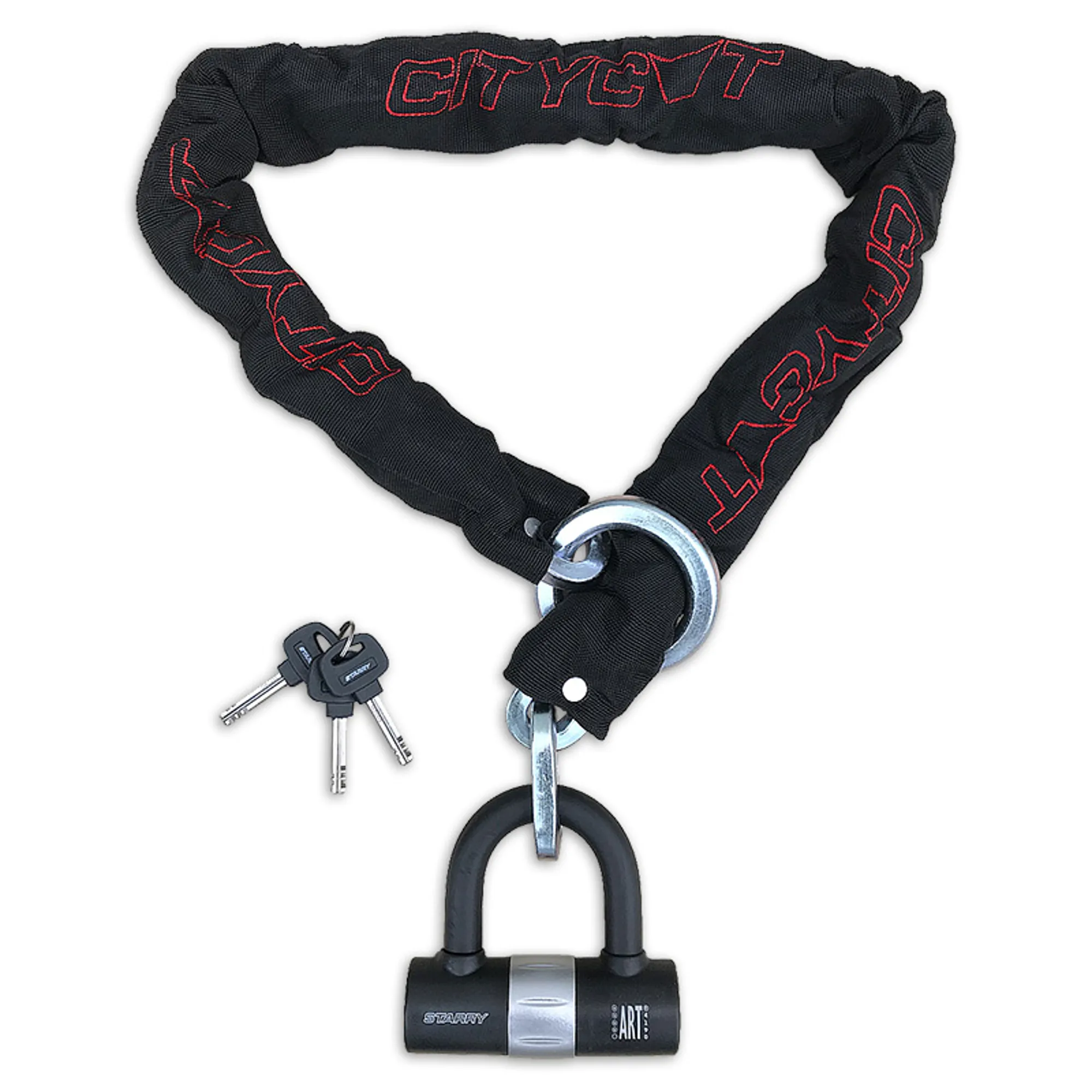 Dit ART 4 kettingslot met loop en mini u-slot van Citycat biedt een goede bescherming tegen diefstal van scooters en motorfietsen. De kettingschakels zijn gemaakt van 10.5 millimeter dik gehard staal, waar een zachte nylon hoes omheen zit ter bescherming van de lak. Één uiteinde van de ketting is voorzien van een loop, waardoor deze makkelijk om een vast object heen te halen is. Nog een pluspunt, met een simpele draaibeweging draai je een kap voor het sleutelgat, waardoor de cilinder mooi schoon blijft. Wordt geleverd met drie sleutels. Met infokaart.