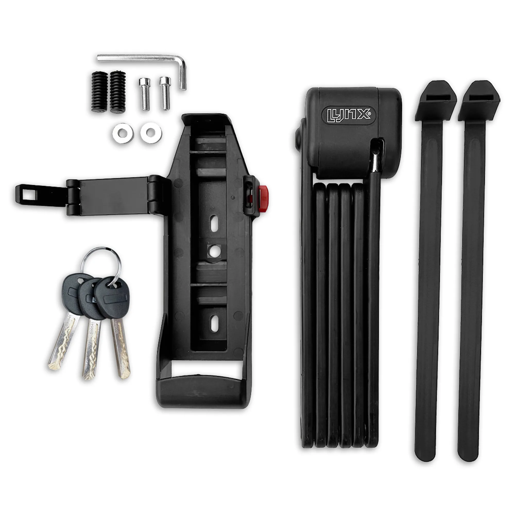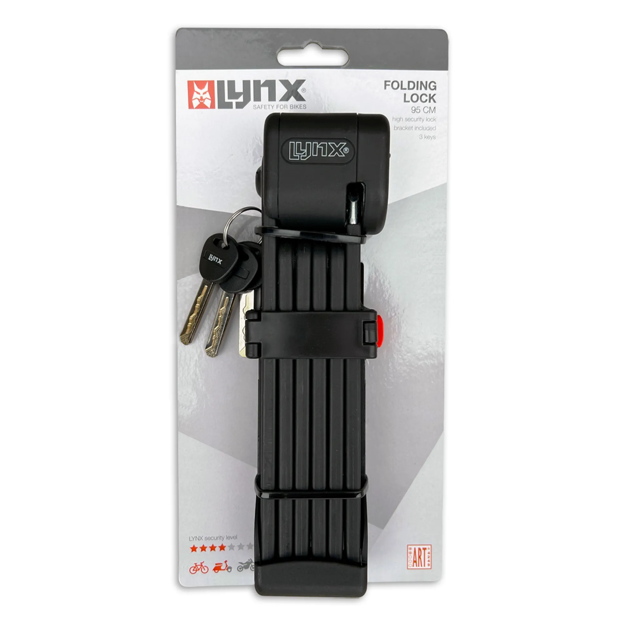 Het Lynx Pivot vouwslot met ART 2 keurmerk biedt optimale bescherming tegen diefstal van bijv. de fiets, e-bike of fatbike. Dit sterke veiligheidsslot is compact, flexibel en eenvoudig in gebruik. Gemaakt van gehard staal, biedt dit slot maximale bescherming en is het gemakkelijk om verschillende objecten heen te vouwen. Dit Lynx Pivot ART 2 vouwslot wordt geleverd met een opberghouder die aan het fietsframe kan worden bevestigd voor gemakkelijk transport. Het afsluitbare slothuis is voorzien van een cilinder welke bestand is tegen boren en lockpicking. Daarnaast is het materiaal van het vouwslot corrosie werend, water- en stofbestendig. De Lynx Pivot heeft een uitgeklapte lengte van 95 centimeter en weegt slechts 1,2 kilogram. Wordt geleverd met 3 sleutels en alle benodigde materialen om de opberghouder aan de fiets te monteren. Op hangkaart.