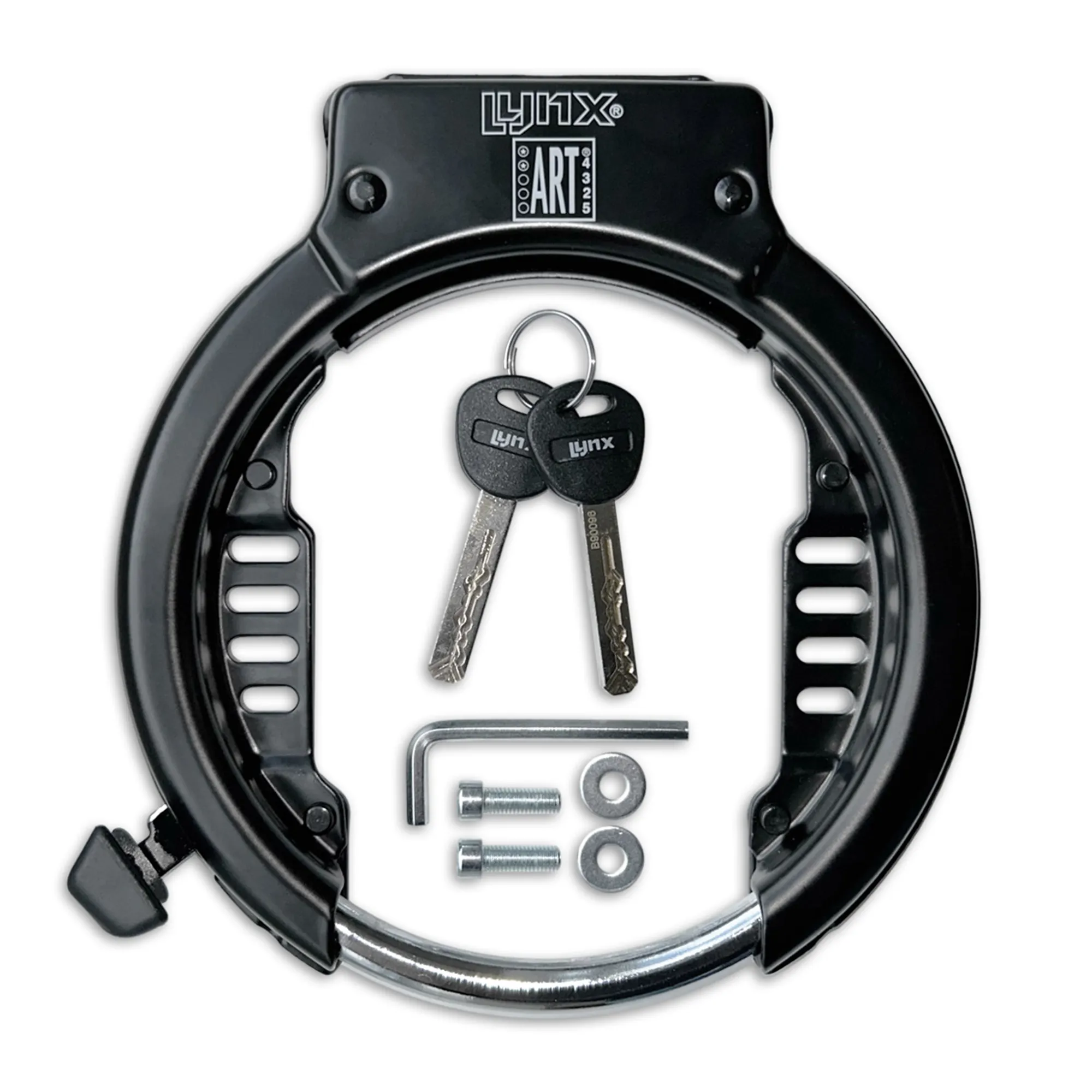 Het Lynx ART 2 ringslot XL OEM biedt uitstekende diefstalbeveiliging dankzij het officiële ART 2-keurmerk. Dit keurmerk garandeert een hoog niveau van veiligheid, waardoor het slot voldoet aan de eisen van fietsverzekeraars. Het extra brede ontwerp maakt het slot bijzonder geschikt voor fietsen met brede spatborden: de afstand tussen de bevestigingspunten is 95 mm en de maximale spatbordbreedte is 106 mm.