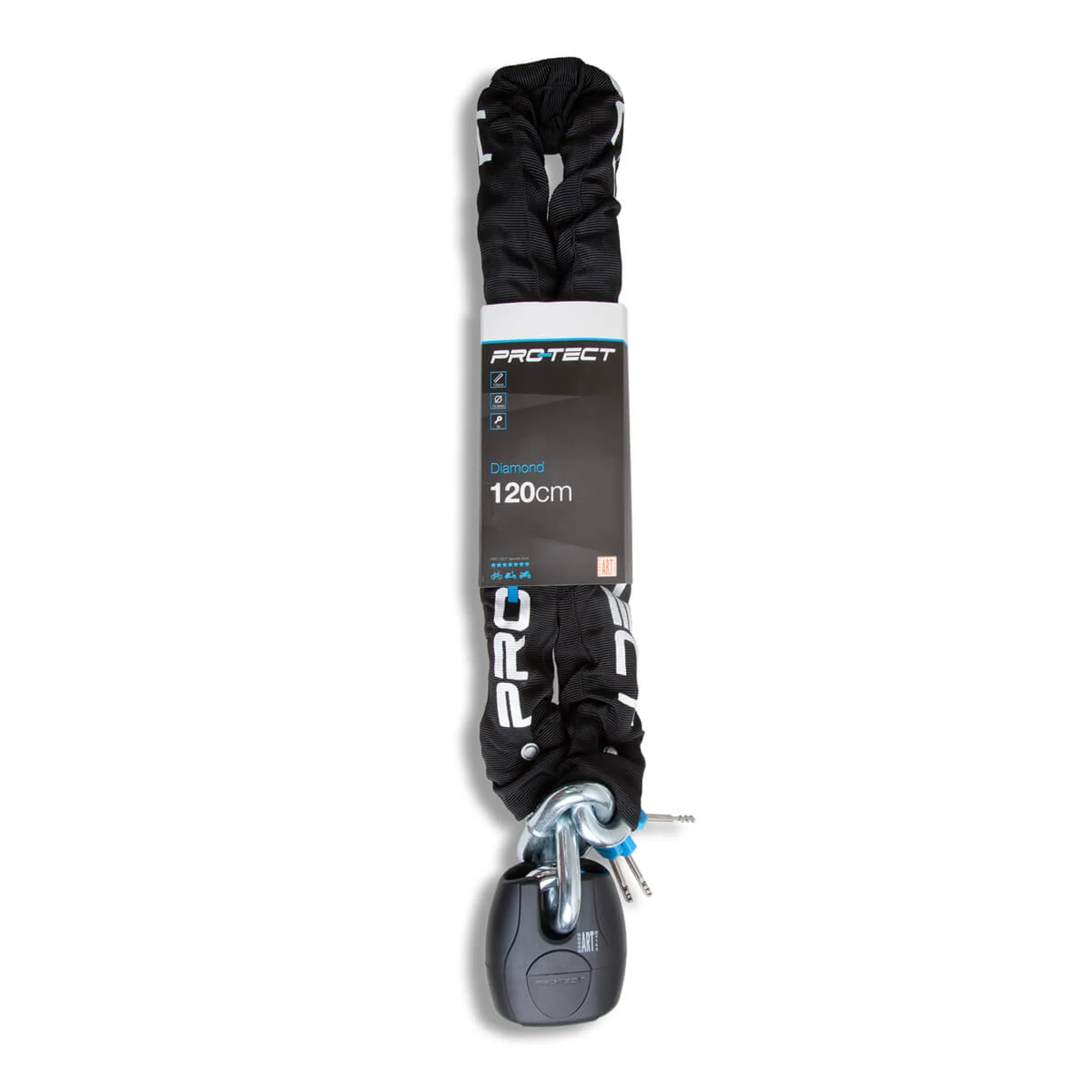 Pro-Tect Diamond ART 5 kettingslot met 14,5 mm ketting van gehard staal, lengte 120 cm. Hangslot met versterkte cylinder tegen boren en inslag. Het cylinderplaatje beschermt de cylinder tegen stof en vocht. Sterke nylon hoes beschermt het lakwerk. Met een schuifkaart en 3 sleutels