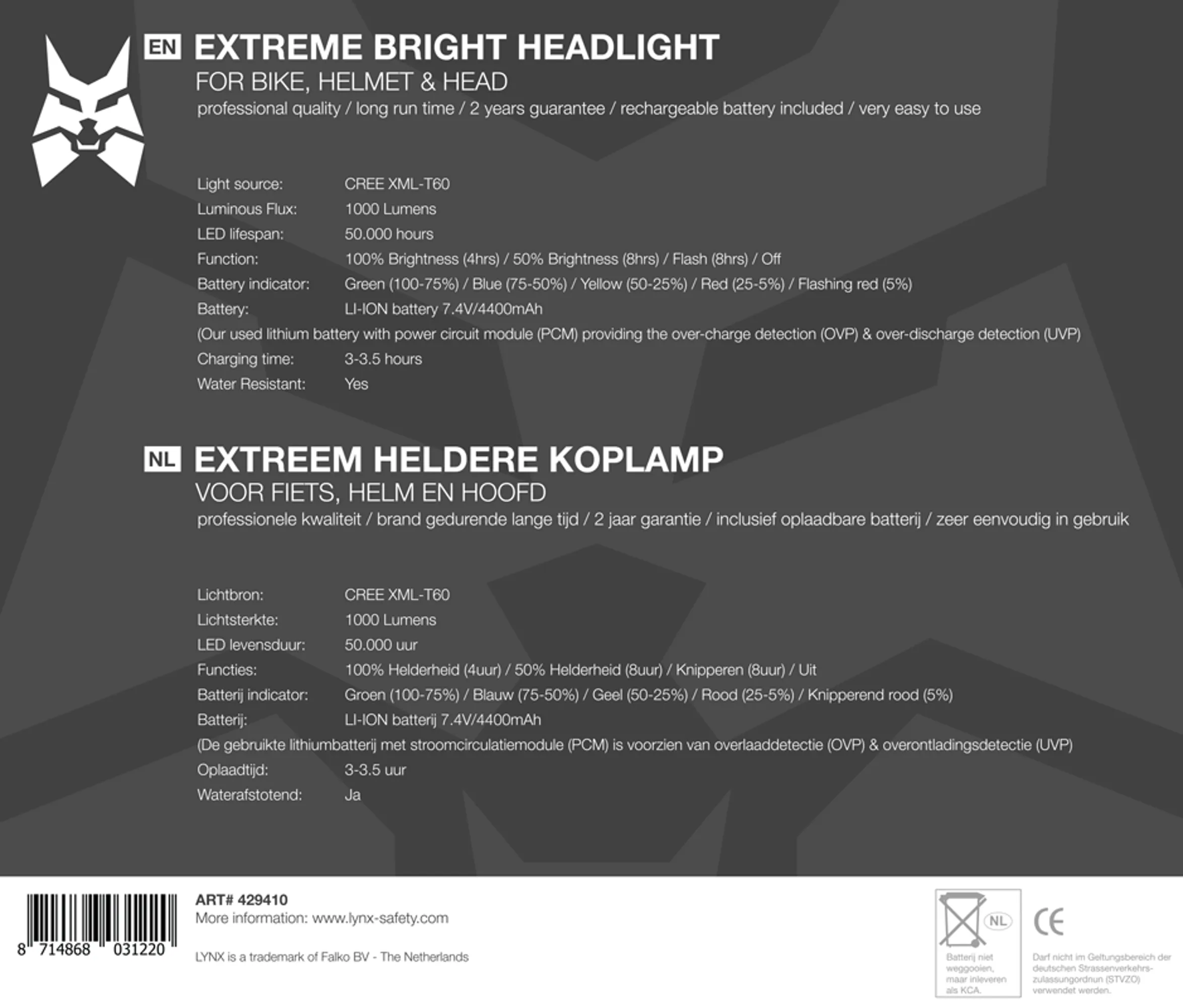 Lynx Pro extreem heldere koplamp voor op fiets, helm en hoofd. De koplamp bevat een krachtige Cree XML-T60 LED, met een lichtsterkte van 1000 lumen. De Lynx Pro koplamp beschikt over drie functies en is in 3 à 3,5 uur op te laden met de meegeleverde kabel. Bovendien is de koplamp waterbestendig, erg eenvoudig te gebruiken en 2 jaar garantie. In een display box geleverd, met diverse accessoires.
