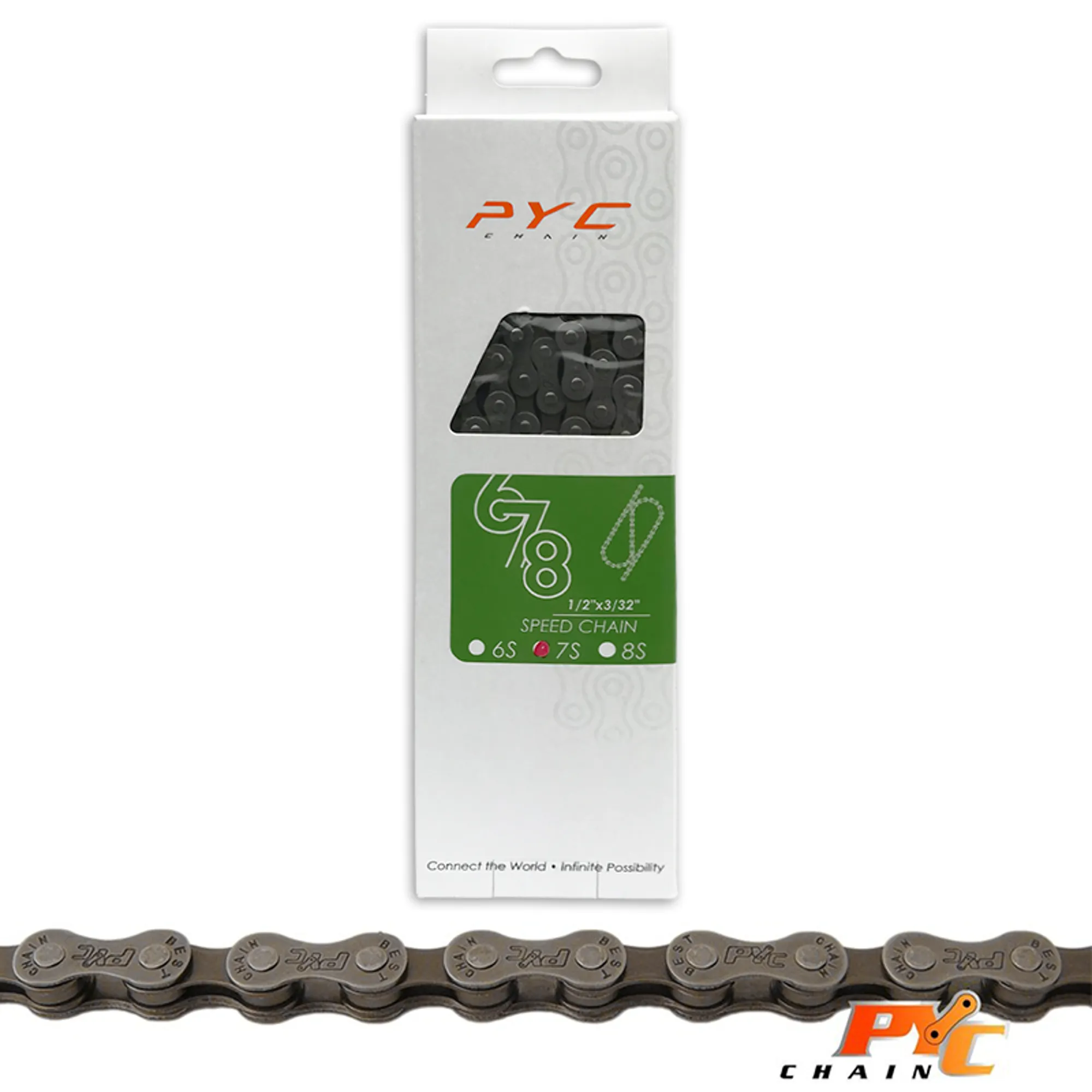 Deze PYC fietsketting is een ketting voor fietsen met 7 versnellingen. De ketting heeft 116 schakels en een maat van 1/2 x 3/32 inch, inclusief connector link. De fietsketting is geschikt voor Shimano systemen en heeft een slijtvaste oppervlaktebehandeling voor een hogere duurzaamheid. In hangdoosje.