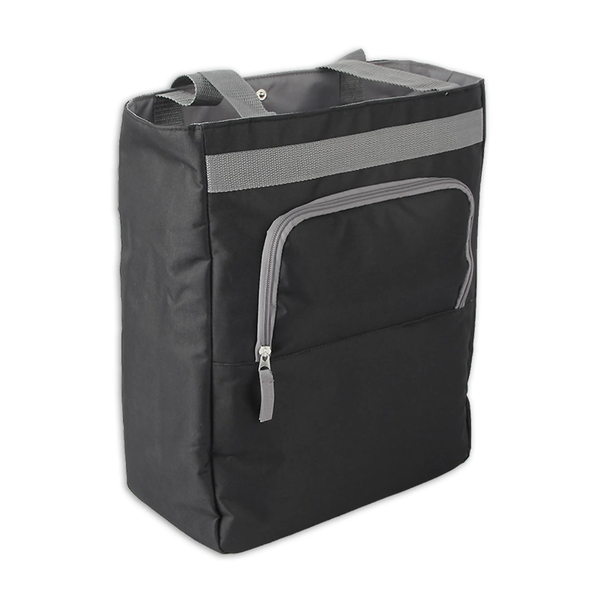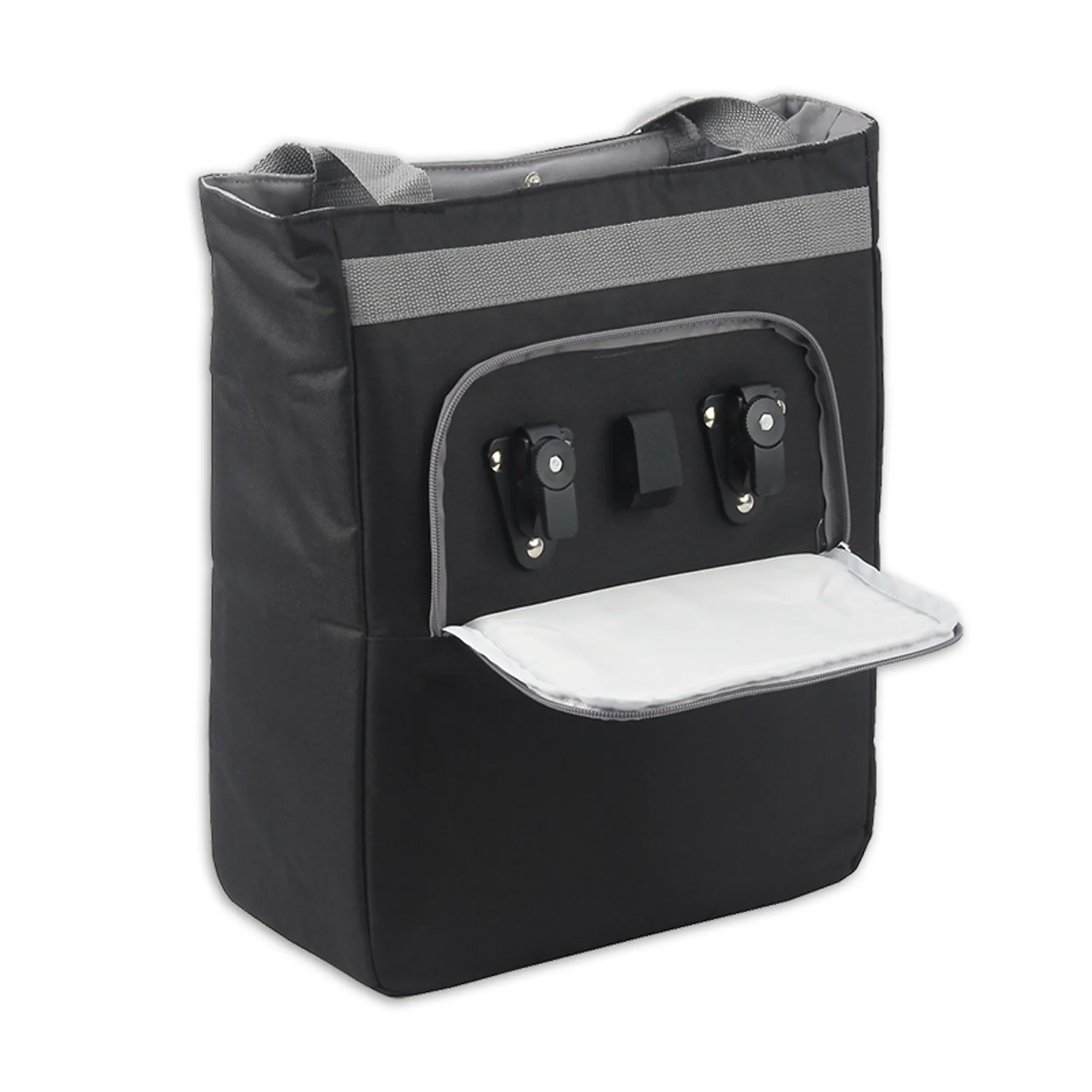 Deze geïsoleerde fiets boodschappentas/koeltas van Lynx is perfect voor het transporteren van voedsel en dranken uit de koeling of vriezer. Dankzij de geïsoleerde binnenzijde houden de producten langer hun lage temperatuur vast onderweg naar huis. Een dagje naar het strand? Voeg koelelementen toe en je bent de rest van de dag voorzien van koude drankjes. Deze koeltas in de kleuren zwart/grijs heeft een inhoud van 19 liter, voorzien van voorvakje met rits en is dankzij de verstelbare haken makkelijk aan de drager te bevestigen. Met infokaart.